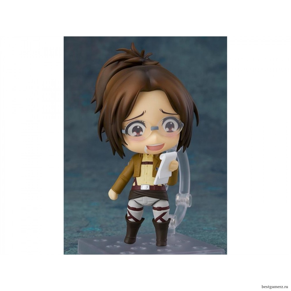 В этом Нендороиде есть командир отделения Survey Corp Ханджи Зоэ из популярного аниме-сериала «Атака на Титана!». На фигуре изображены три лицевые панели, на которых изображено ее стандартное выражение лица, ее улыбающееся выражение, которое часто можно увидеть в бою, и ее взволнованное выражение лица после показа Титана!