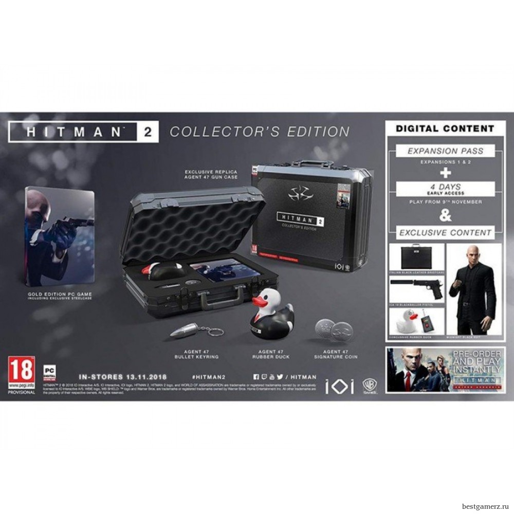 Цифровой контент Hitman 2 Gold Edition: Эксклюзивный контент: итальянский черный кожаный портфель, черный пистолет ICA 19, резиновая утка "Сотрясение мозга", черный полуночный костюм Агент 47 точная копия пистолета Стальной кейс Брелок Agent 47 Агент 47 резиновая утка Агент 47 подписная монета